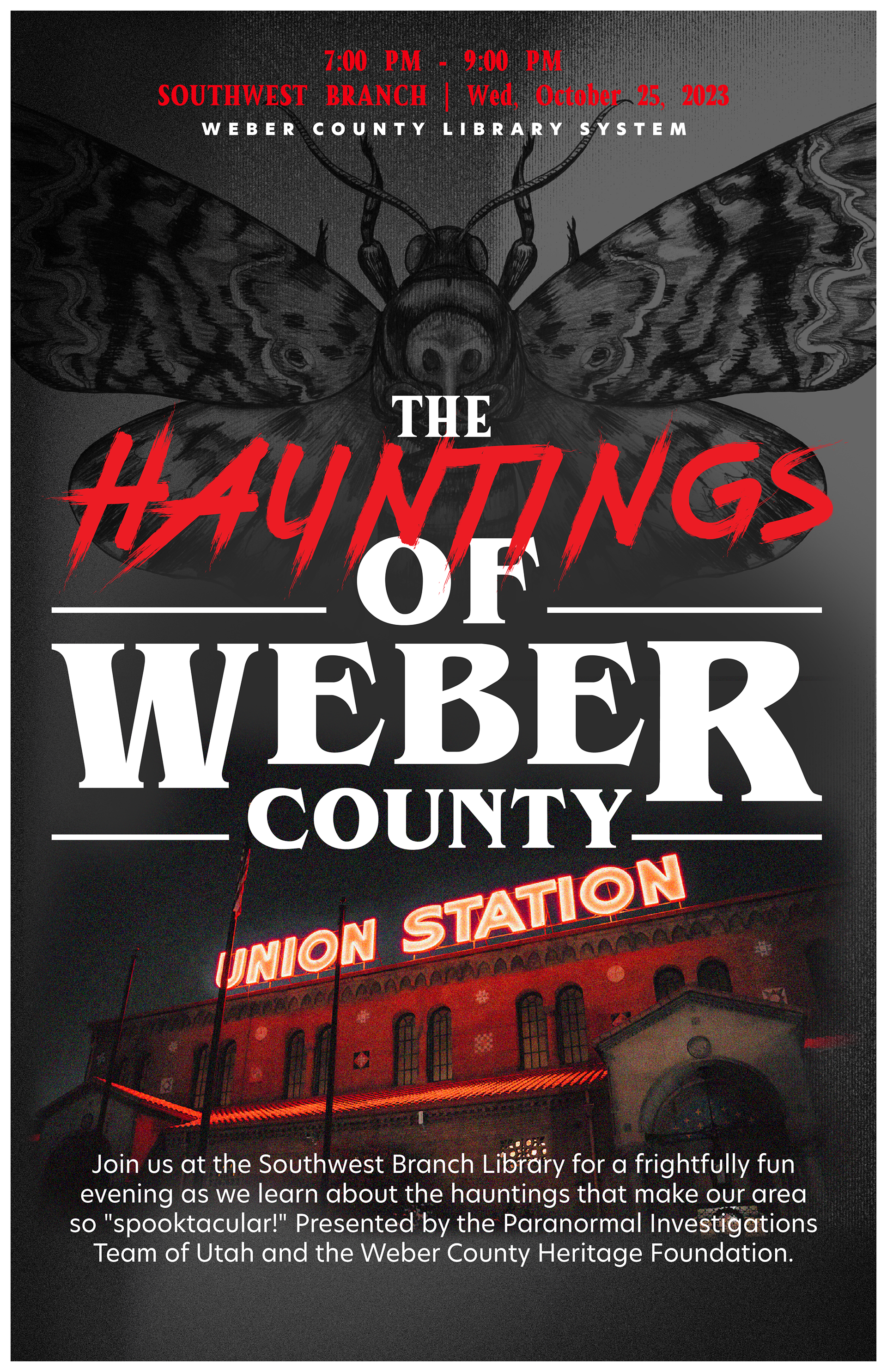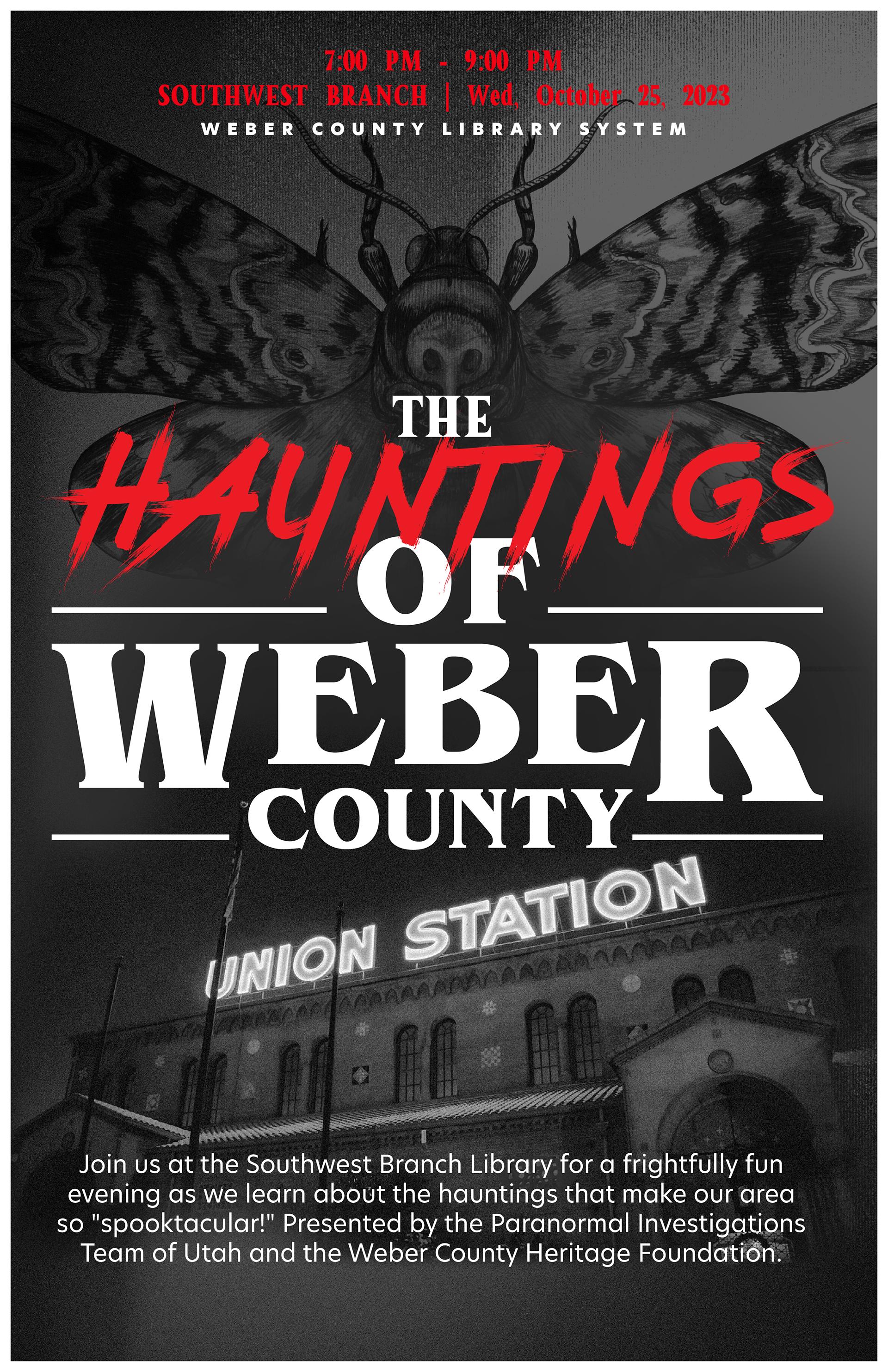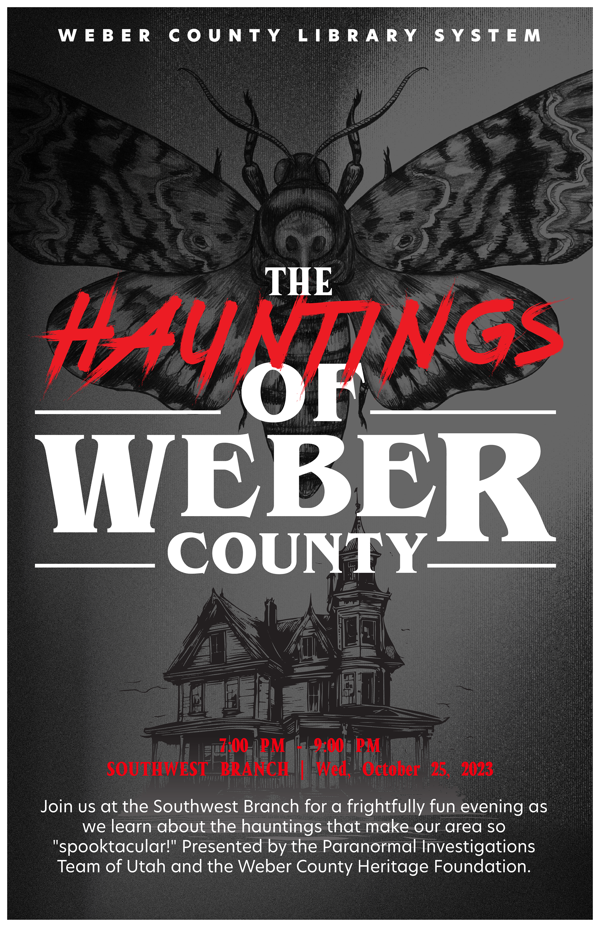 Logos, posters, and advertising for a paranormal history event at Weber County Library, Utah. Concept for the poster and Logo was a "Stephen King" novel cover.