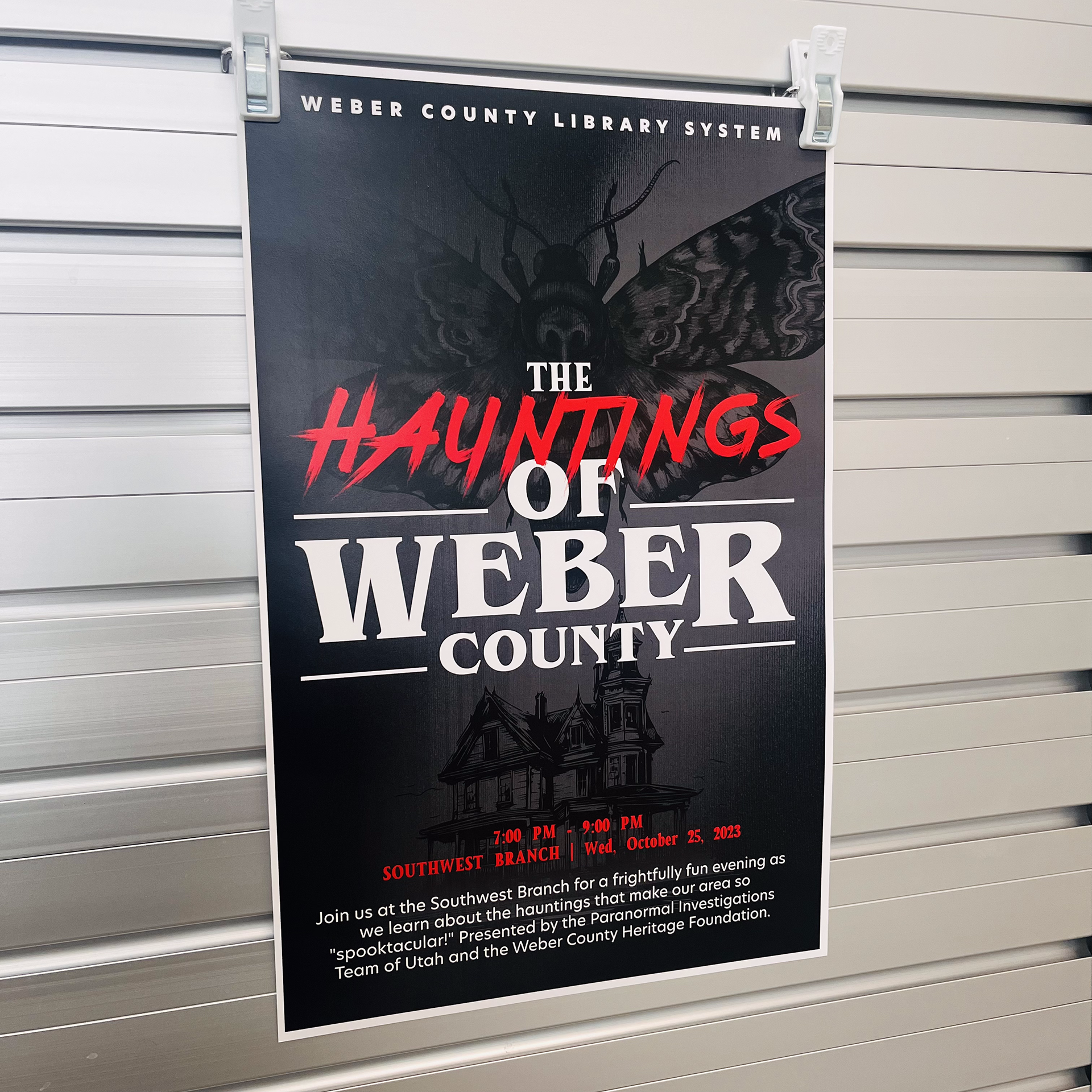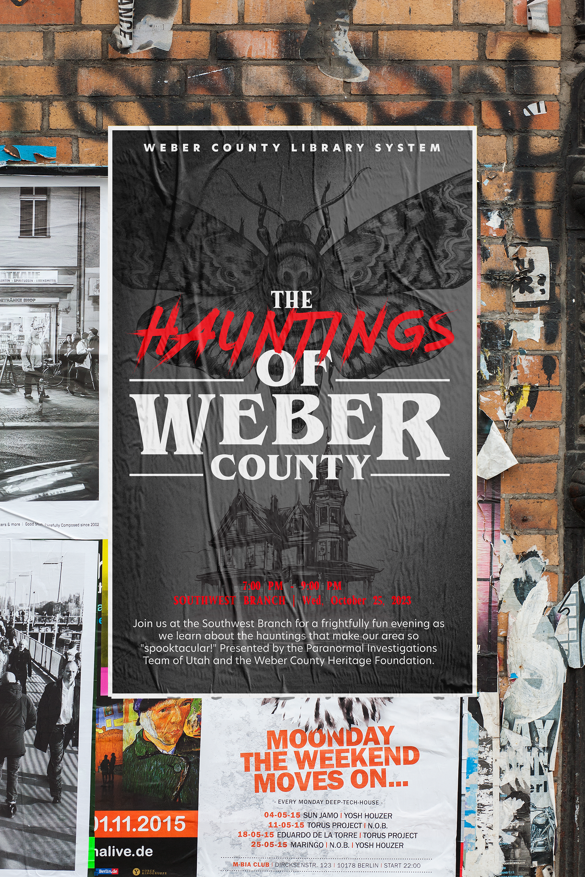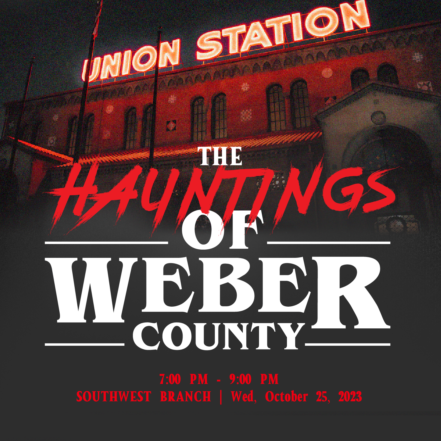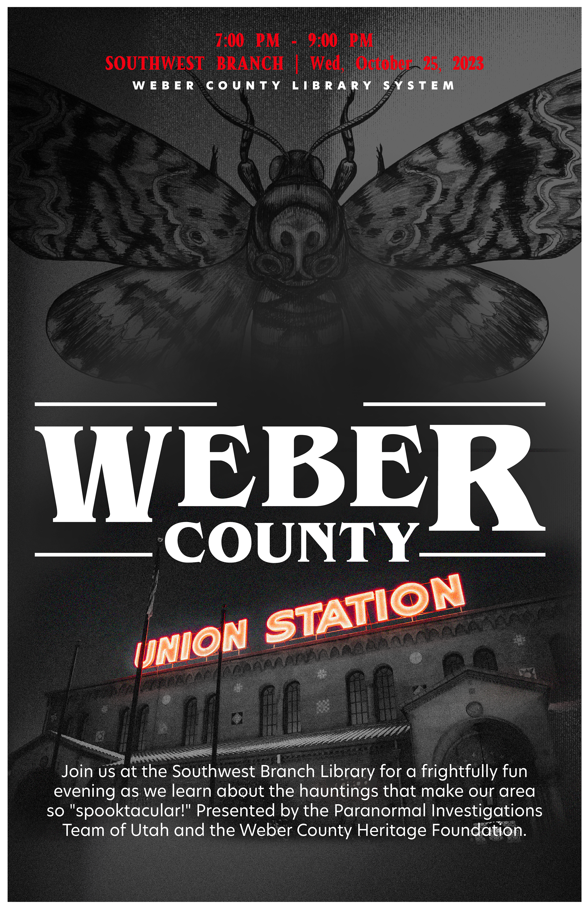 Logos, posters, and advertising for a paranormal history event at Weber County Library, Utah. Concept for the poster and Logo was a "Stephen King" novel cover.